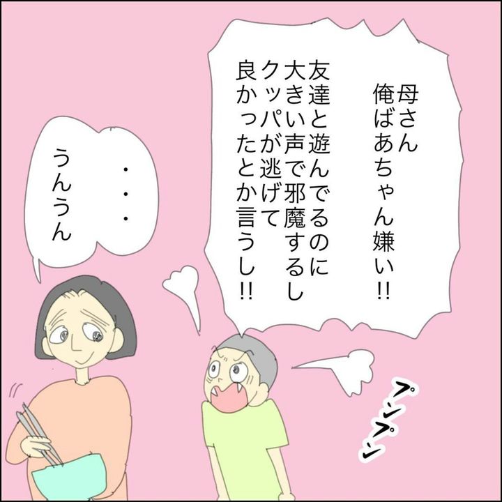 長男・学くんは、友だちと遊んでいるところに祖母が来たり、「カメが逃げてよかった」と言われたりしたことで、ガマンの限界に達してしまいました。ついに「おばあちゃん嫌い」と、言ってしまうほど。