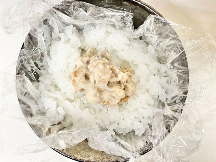 6.ラップを巾着みたいに具材をギュッと包んでおにぎりを握ったら出来上がり。