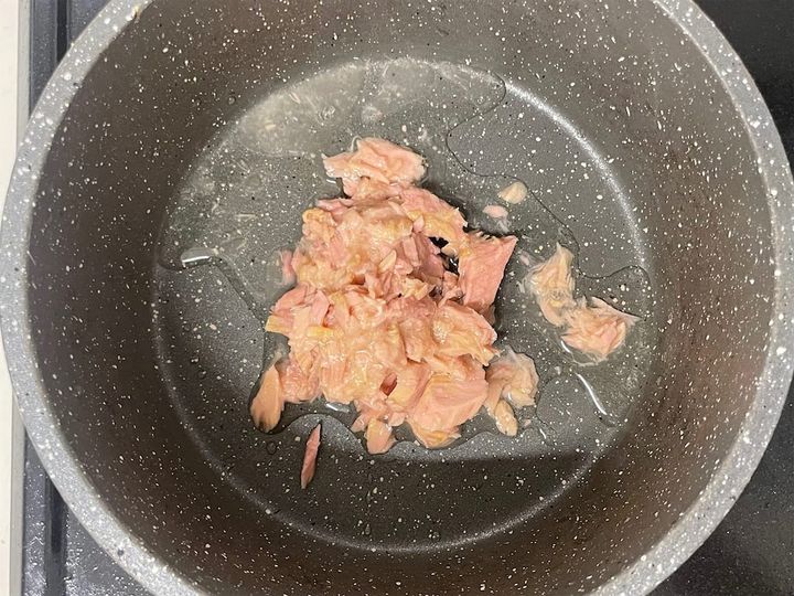 1.中火で熱したフライパンにツナを汁ごと入れて、汁気がなくなるまで5分程炒めます。じっくり炒めることでパラパラに。