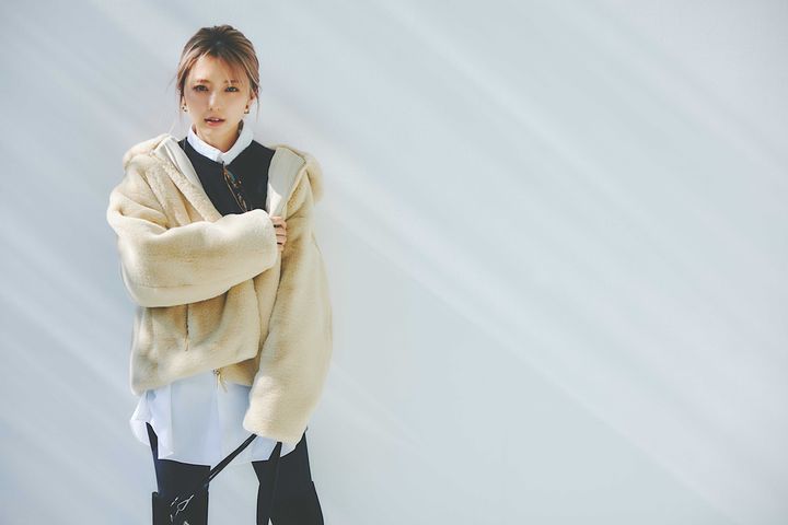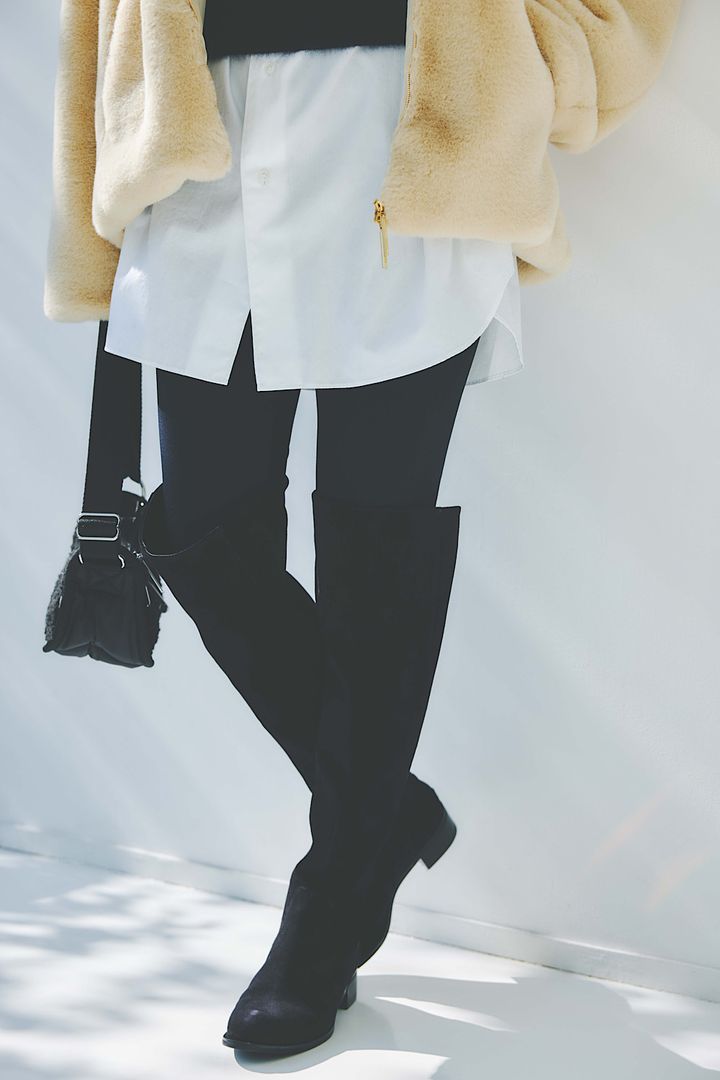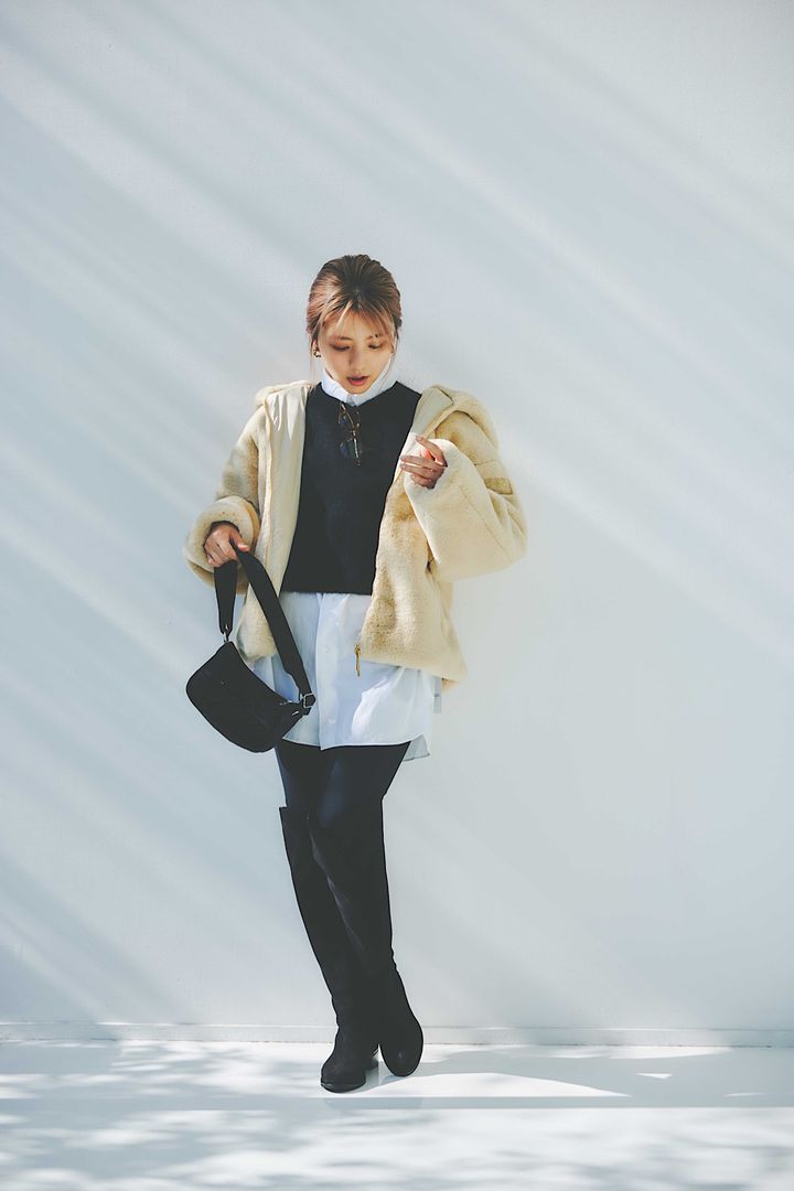 「YUMOLA」エコファーフーディボアブルゾン¥59,400(タトラス/タトラス コンセプトストア 青山店)クロップド丈フォックスファーニット¥26,400<エイチ ビューティー&ユース>チュニック丈シャツ¥38,500<ロエフ>(ともにエイチ ビューティー&ユース)レギンス¥11,000(トゥー ユナイテッドアローズ/ユナイテッドアローズ 渋谷スクランブルスクエア店)バッグ¥17,600(レスポートサック/レスポートサック ジャパン)フラットニーハイブーツ¥39,600(ダイアナ/ダイアナ 銀座本店)イヤリング¥13,200(IRIS 47)メガネ¥38,500(ワンスリー コンパウンド フレーム/デュアル)
