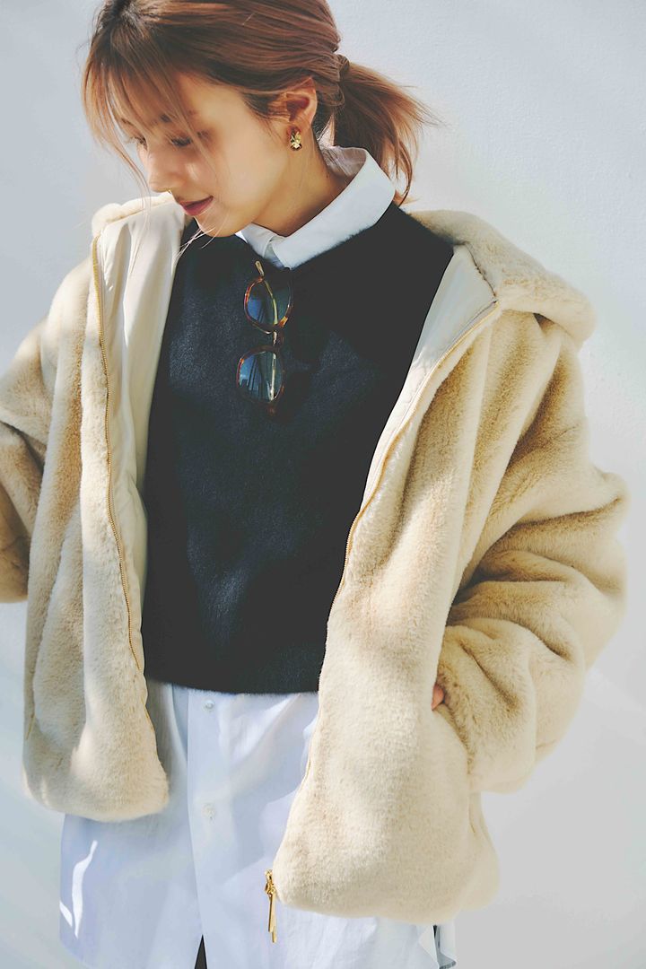 スタイルアップ要素を盛り込んだモノトーンコーデなら、ベージュのファーブルゾンを引き立てながら、ボリュームアウター特有の着ぶくれを防ぎます。合わせるコーデを辛口に振り切れば、ファーブルゾンが幼く見える心配もなし。首元がごちゃつかないように、髪もひとつにまとめて、すっきりと。