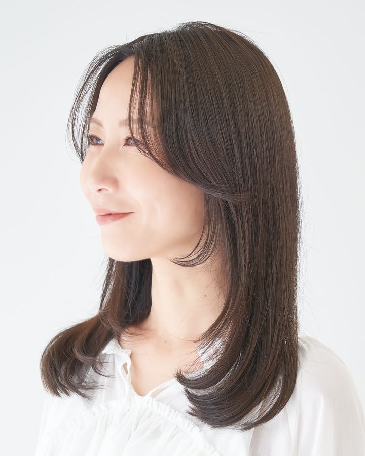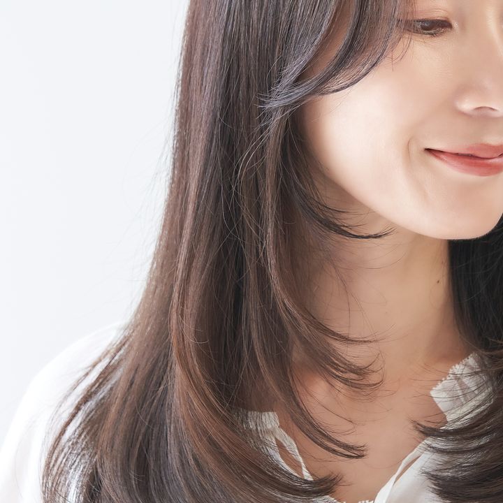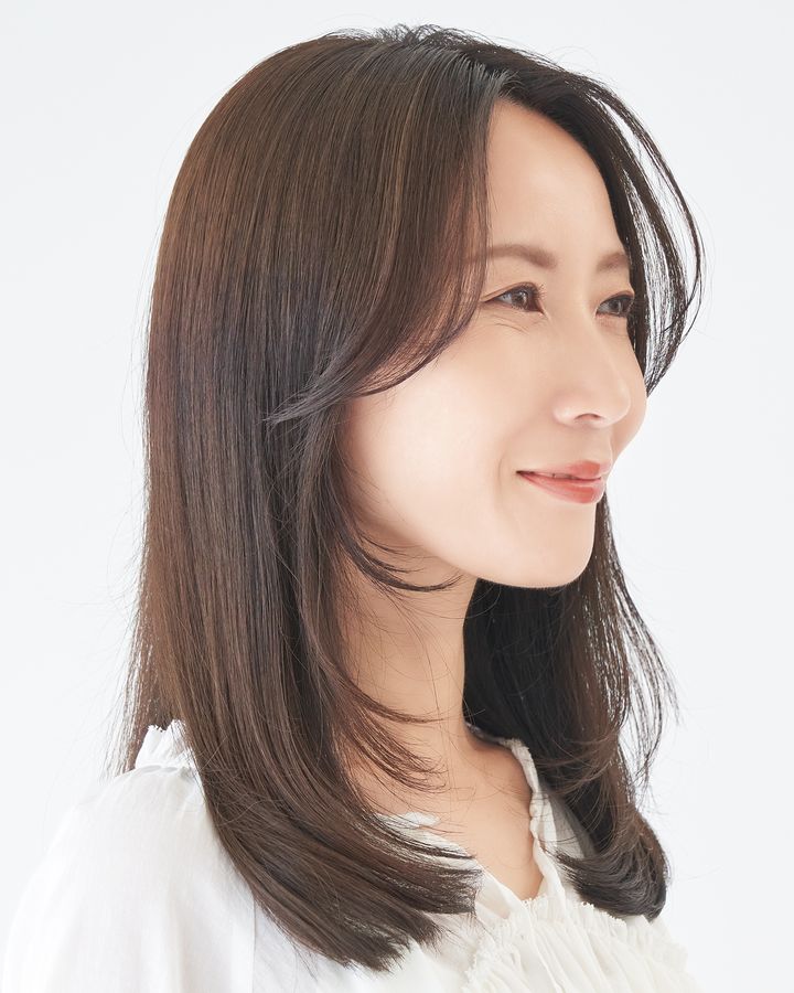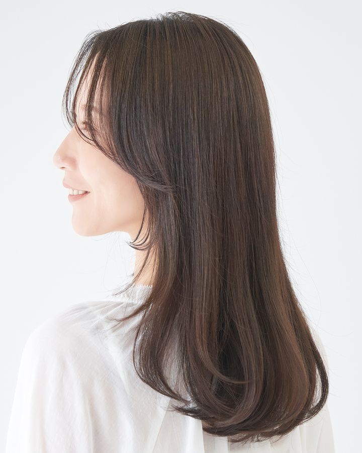 年々クセが出てきて朝のブローが必須になり、セット時間も長くなっていく…という悩みには、「毛先は重めだけど、顔周りに動きがある」ナチュラルストレートロングが◎。