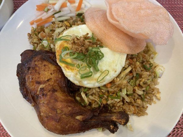2回目にお訪ねしたときにはやっぱり一度は食べてみたい有名な『ナシゴレン』よね、とお願いしました。 インドネシアのスパイスの効いた焼き飯なのですね。添えてある大きなチキンはオプションでその時のお腹に合わせてつけたり、つけなかったり選べるようで、せっかくなのでチキン付きをお願いしました。