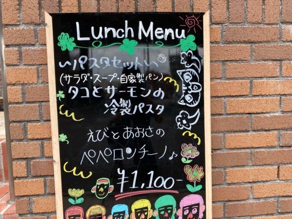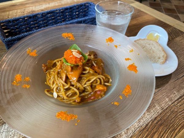 ランチは、タコとサーモンの冷製パスタかエビと青さのペペロンチーノから選べる「パスタセット」1100円と自社ビールを使った本格的な「マグマカレー」1100円(1日限定10食)がありました。