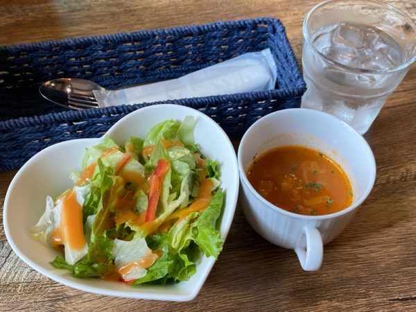 迷ってこの時期に食べたい「タコとサーモンの冷製パスタ」にしました。自家製ドレシングのサラダとスープも付いています。