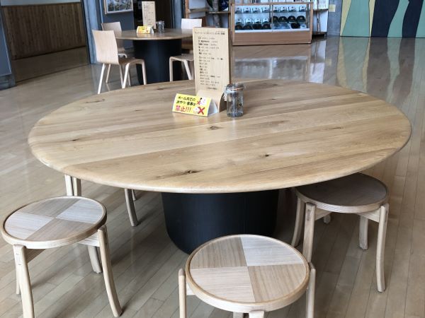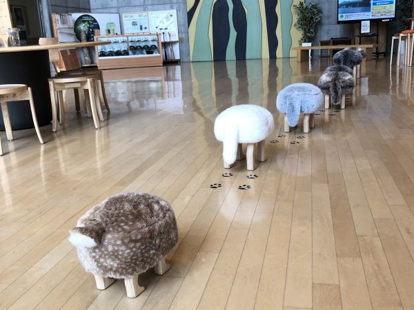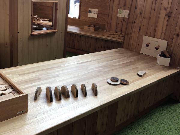 木を使った椅子やテーブルもありました。しっぽと足がついた小さな椅子がなんとも可愛い!木のテーブルには、ウッディホールで使われている木材(樹種)が書いてありました。木の家具は温かみがあっていいですよね。