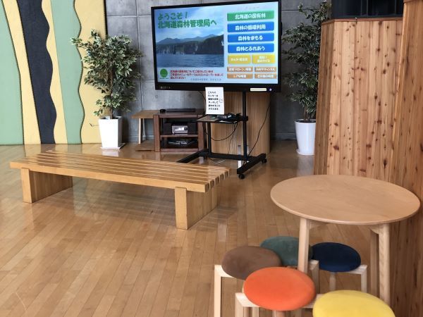 ウッディホールには、おもちゃがある木育コーナーだけでなく、他にも展示やモニターがありました。タッチ操作が出来るモニターでは、北海道の国有林や森林について学んだり、クイズに挑戦できるようです。