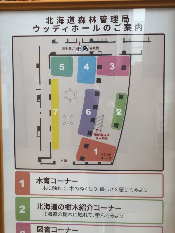 HPに『ウッディホールは、平成5年3月にエゾマツやドドマツ、ミズナラ、ハリギリ(センノキ)など北海道の木材をふんだんに使って完成した「木の空間」です。』と記載されています。木の中で過ごす空間はとても癒されました。みなさんもぜひ、「木の空間」に癒されに行ってみて下さい。