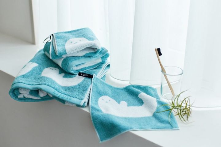 左上から反時計まわりに、kippisあざらし柄ウォッシュタオル、フェイスタオル、バスタオル、タオルハンカチ。