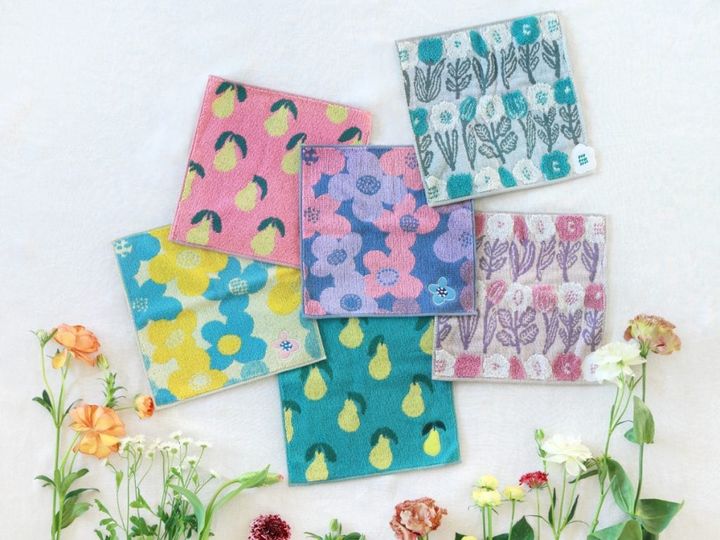 洋ナシなどの果物やお花をモチーフにしたテキスタイルデザインを採用したタオルも人気。少し派手なカラーリングでもタオルなら抵抗なく使えるので、北欧らしいポップなカラーリングを楽しんでいただけます。