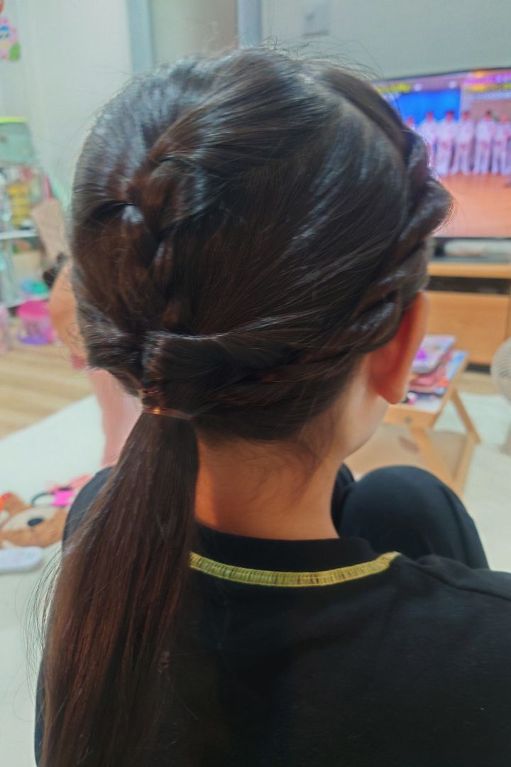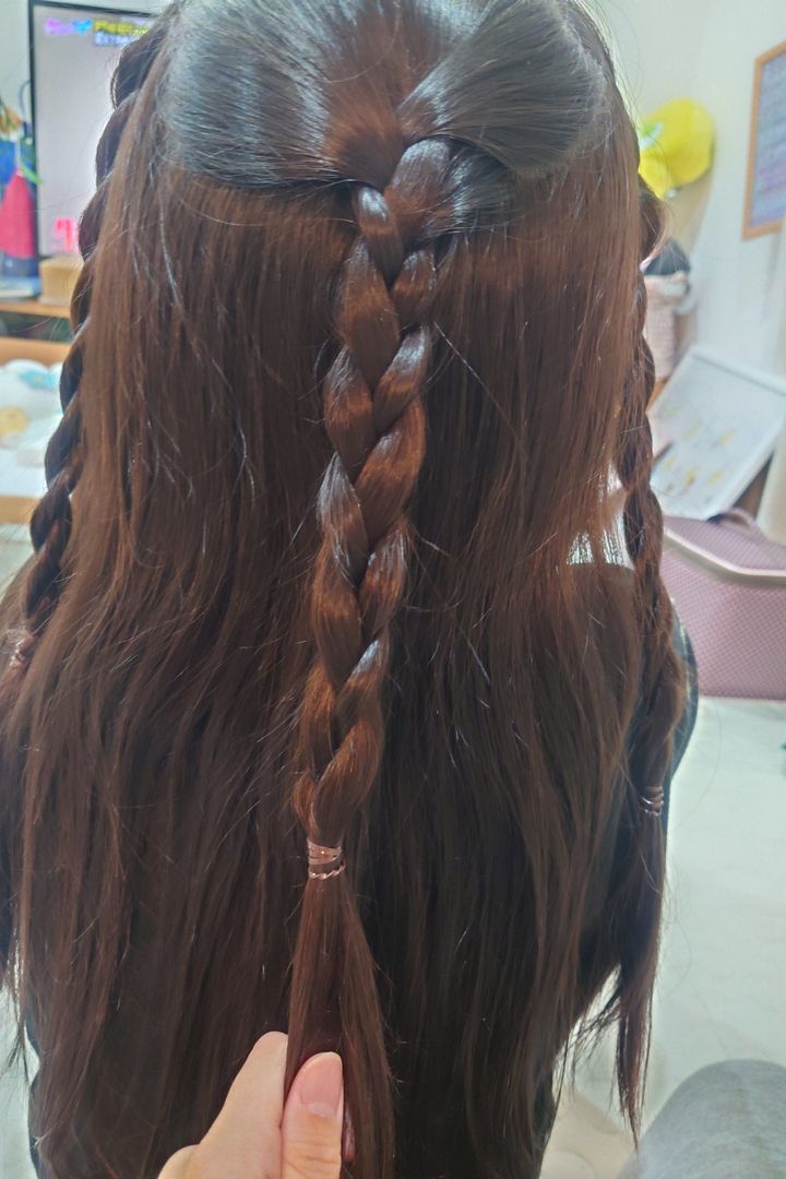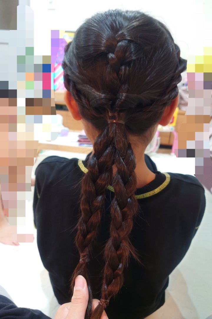 トップの髪を少しとり、三つ編みにします。