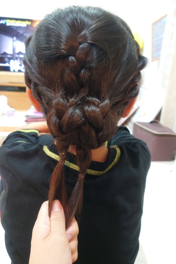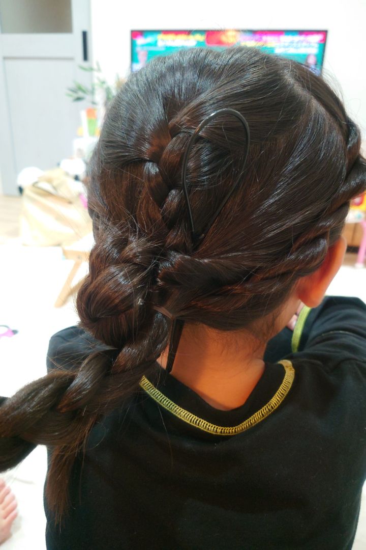 根元にアレンジスティックをさして、三つ編みを根元にいれこみます。