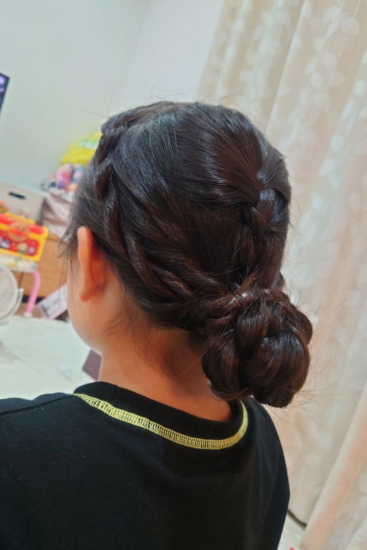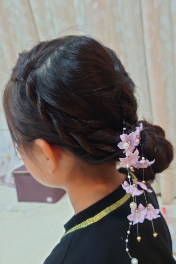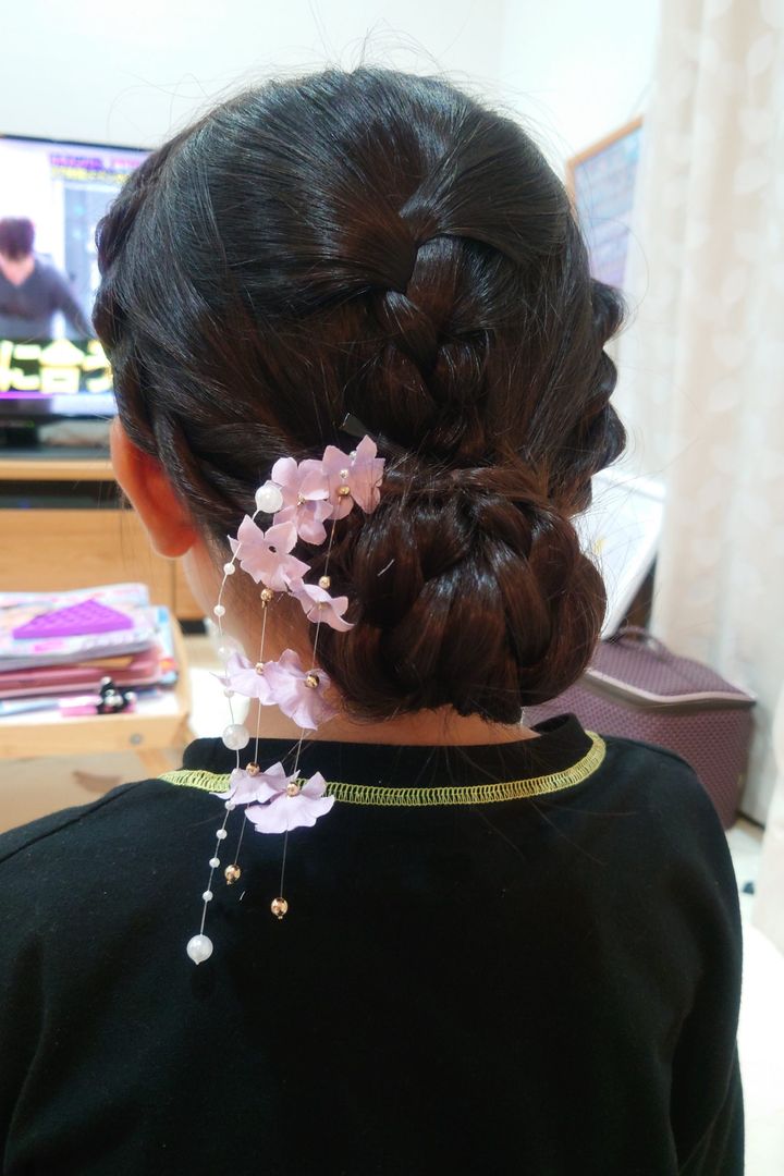 下にでている三つ編みの先を根元に巻きつけて、ピンで固定して、髪飾りをつけたら完成です。