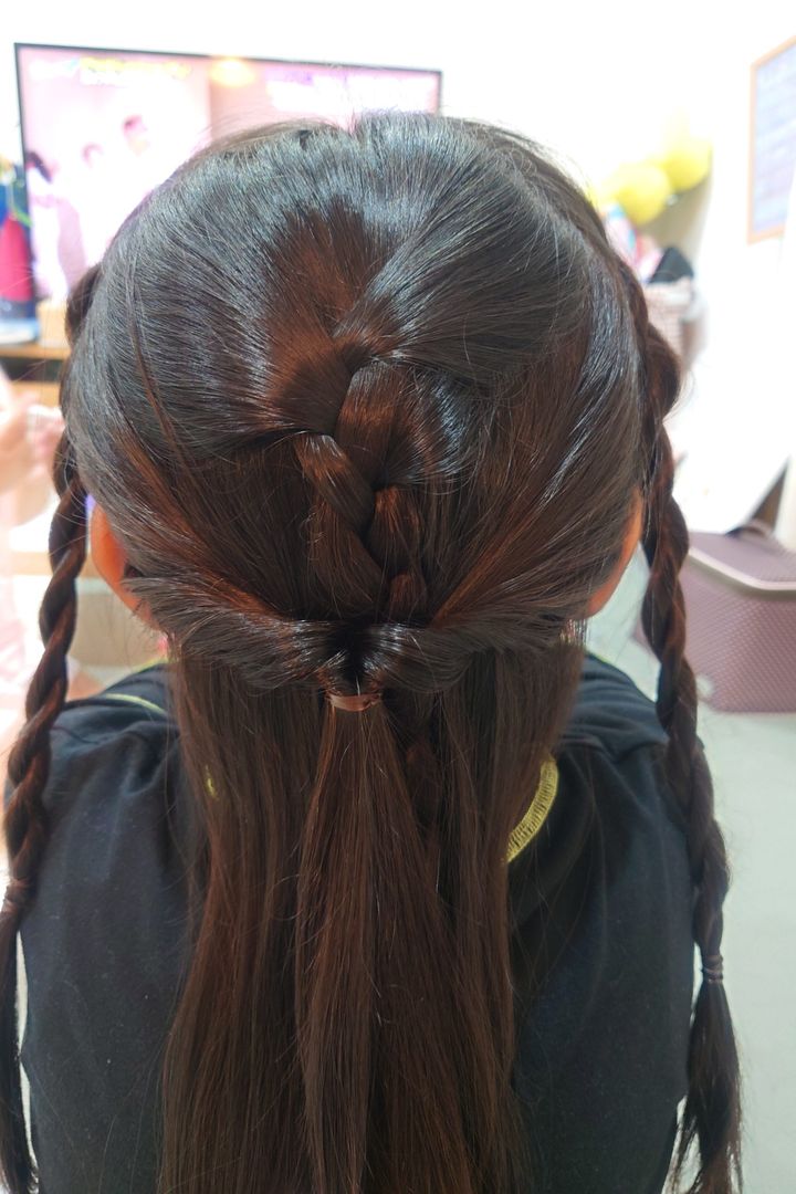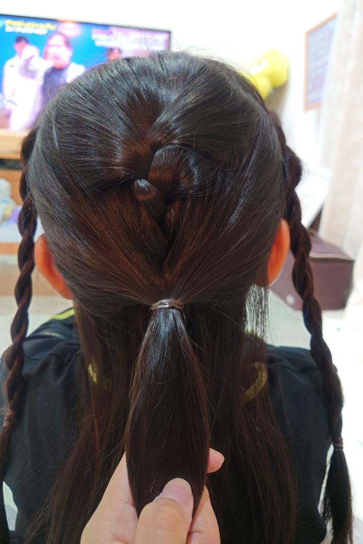 結んだ髪を2つにわけて、三つ編みを2つ作ります。