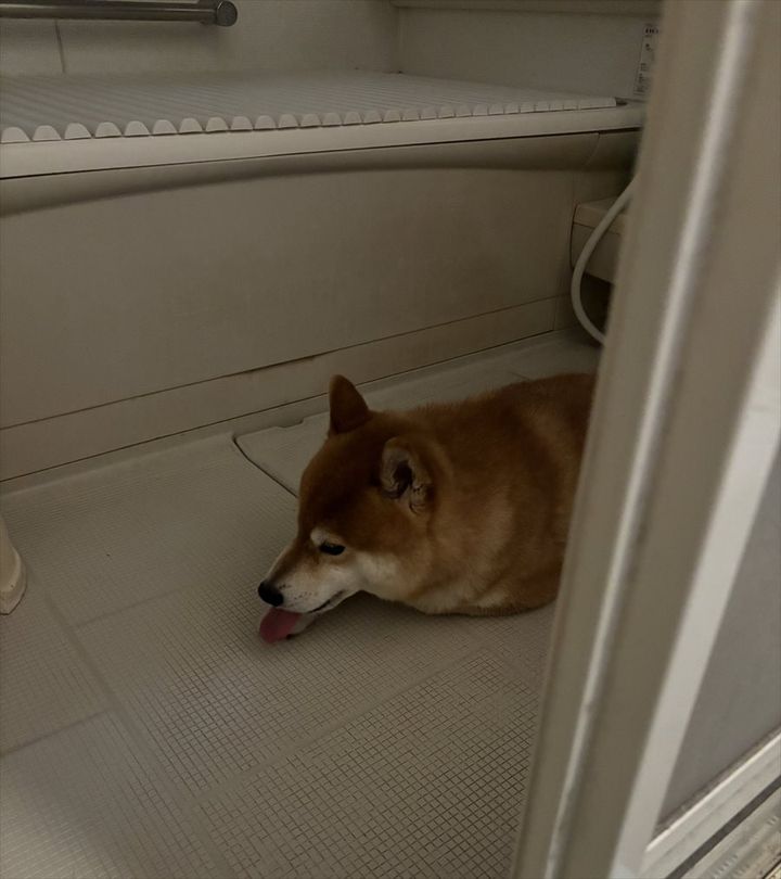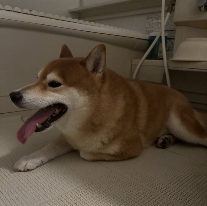 お風呂場で伏せた体勢を取っている小太郎くん。 体を狭い場所に隠すことはできませんでしたが、落ち着ける空間を無事に見つけることができたようでよかったです。