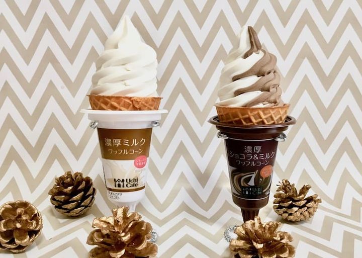 純白のうずまきが際立つローソンの「濃厚ミルクワッフルコーン」(¥220/税込み・写真右)は、甘さよりもミルク感を楽しみたい人におすすめです。