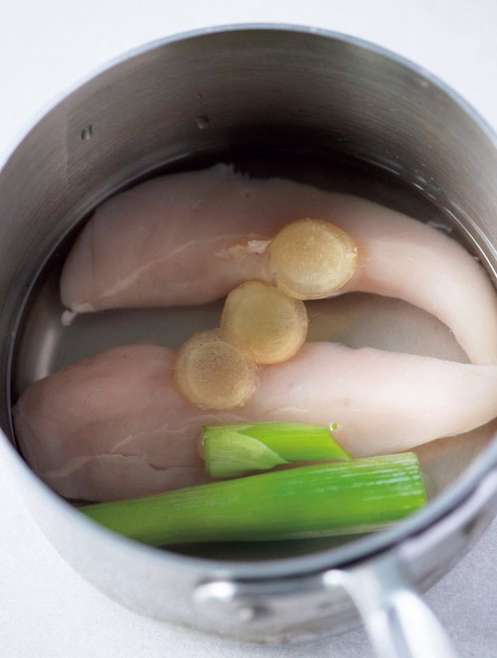 POINT_ささ身は、火が入り過ぎると硬くなってしまうので注意! 湯が沸いたら火を止め、そのまま粗熱を取ることでしっとり食感に。