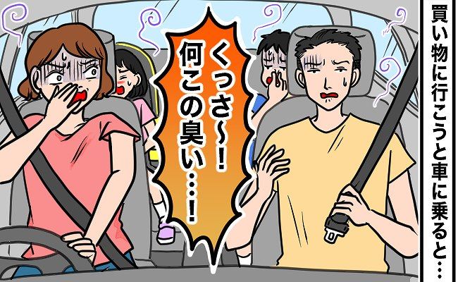 息子たちが中2、小6、長女が4歳のころの話です。ある週末、買い物に行こうと子どもたちと車に乗ると、猛烈な悪臭が!臭いの原因を探してみると……?