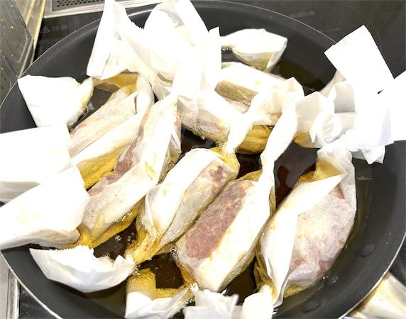 紙包みをすべてフライパンの中に入れ、フタをして揚げます。