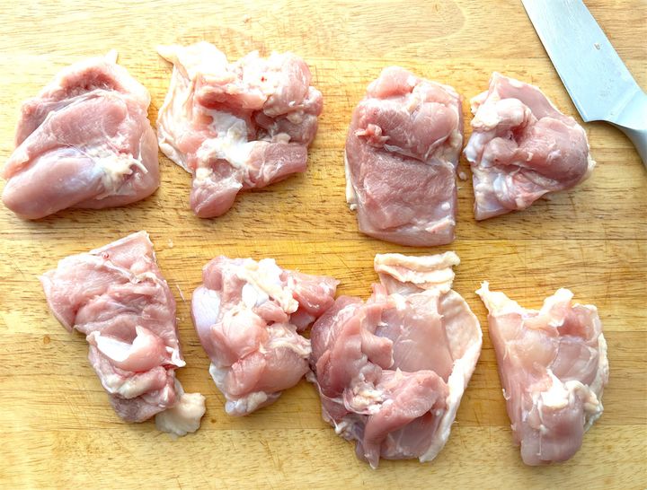鶏もも肉全量をだいたい8等分の大きさになるように切ります。