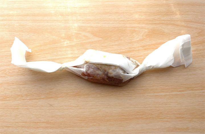 さらに、端から3~4cmのあたりでキャンディ状にねじって、クッキングシートを閉じます。
