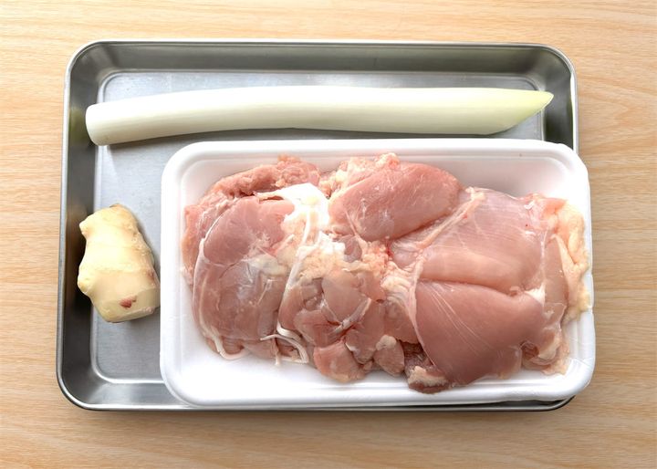 鶏肉の上に1の長ねぎ、しょうがの順に重ねて置き、上から3の鶏肉のつけダレを少々かけます。