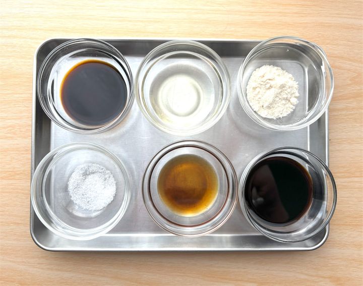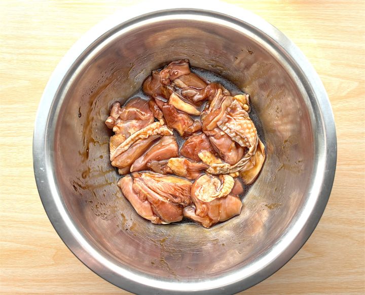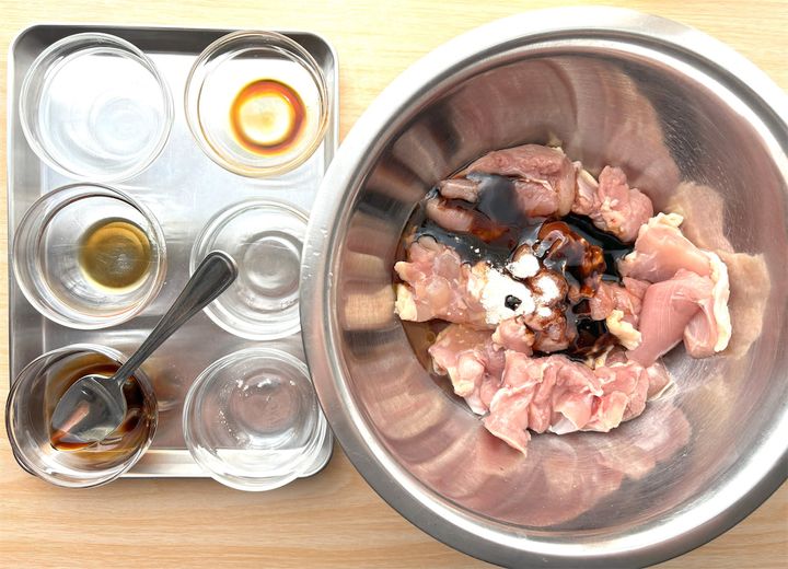 2の鶏肉をボウルに入れ、しょうゆ、オイスターソース、砂糖、酒、ゴマ油、うま味調味料を加えます。
