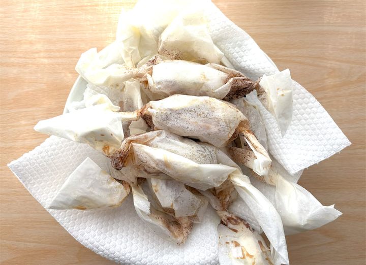 油から引き上げる時は、紙包みの継ぎ目を上にして置きましょう。
