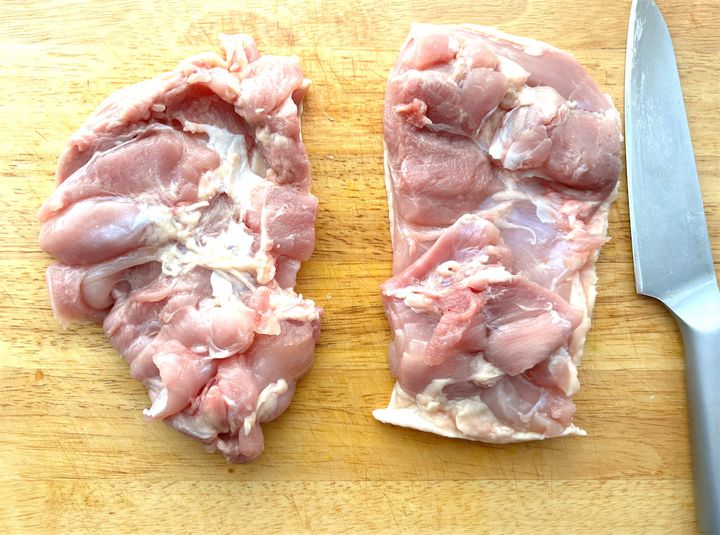 半分に切った鶏肉を、またそれぞれ半分に切ります。