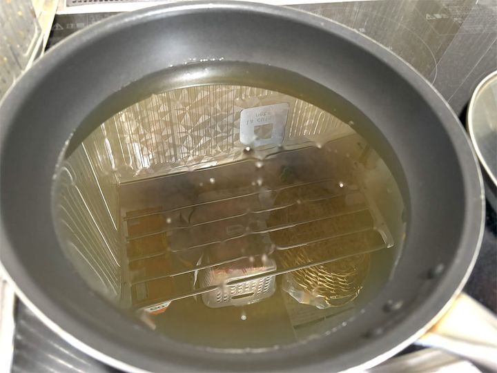 7~8分経ったところで一度フタを開けて、紙包みの向きを少し変え、そのまま2~3分揚げたら完成です。