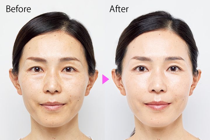 顔全体のくすみが一掃され、頰の色ムラが目立たなくなり、肌トーンも明るくなったのが一目瞭然!キメが整い内側からふっくらとして、肌触りもざらつき感がなくなって柔らかに。むくみも取れて顔全体がキュッと引き締まった印象に。