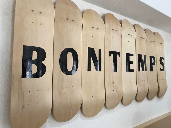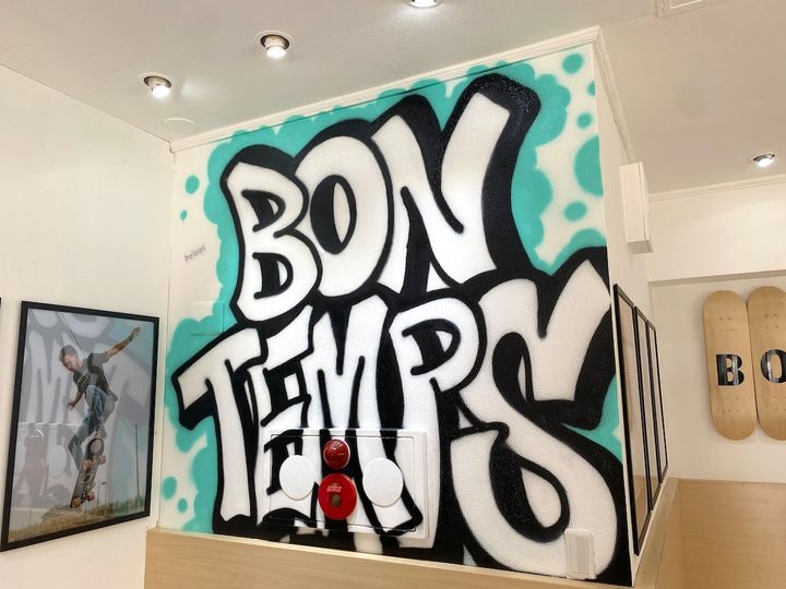 壁に店名のスプレーアートやスケボーの板が飾られていたり、店内の隅にカーブミラーが設置されていたりと映え要素たっぷり。アメリカンな雰囲気を取り入れているのは「BONTEMPS」の社長の好みなのだとか。