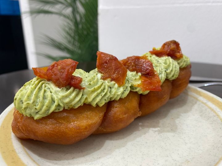 甘いものを食べたら欲しくなるのがしょっぱいもの。「バジルトマト」は食事系ドーナツとして人気の1品です。生地の上には、バジルクリームとオリーブオイル漬けしたトマトをトッピング。バジルのいい香りとトマトのジューシーな酸味と甘みからして、ピザをイメージさせる味わいに仕上がっています。ドーナツ生地の甘みとトッピングの塩味のバランスがよく最後まで食べやすいです。