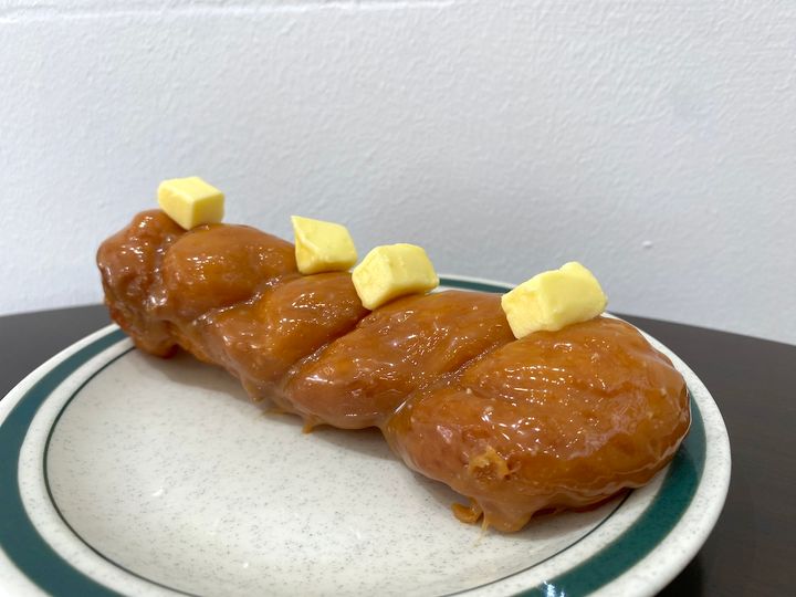 「ソルティッドキャラメル」は、キャラメルでコーティングされたドーナツにバターが4つもトッピングされた悪魔的な見た目。ひと口かぶりつくと、生地の食感に驚き。一般的なドーナツよりも菓子パンに近いもちもちとした食感です。生地全体にちょうどよく油が行き渡っているのもポイントで、重たさを感じにくくなっています。