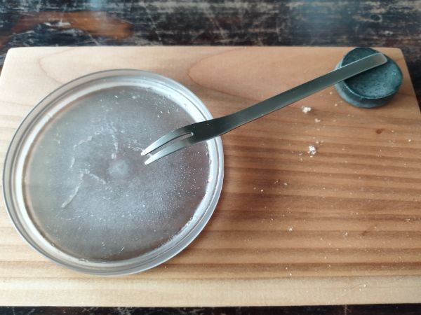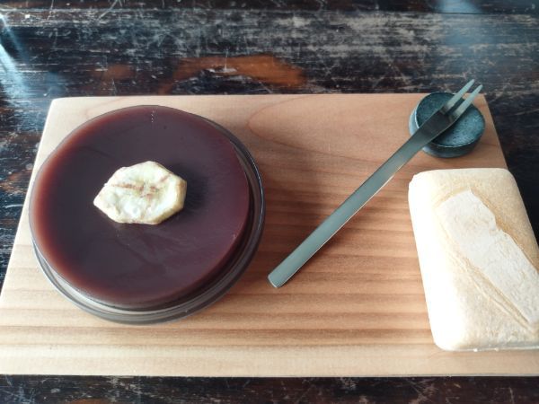 おお!確かにこれは、レコードだあー。丸い羊羹にバナナチップ、最中。なかなか面白い見た目。羊羹、なめらかです。羊羹の甘さを、ときどき、最中で口直し。バナナチップも、違う食感になって楽しい。ん?これは。このフォークはもしや?