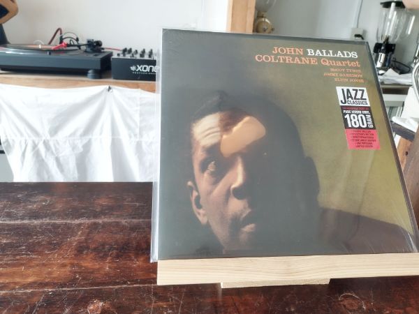 ジャズで有名なジョン・コルトレーンのレコードがカウンターに飾られています。