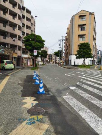 福岡市地下鉄貝塚線「箱崎九大前」から、箱崎新道をJR箱崎方向へ向かいます。
