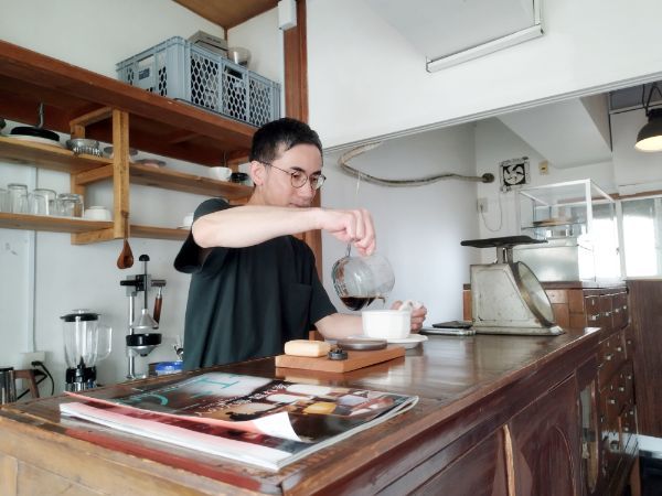 珈琲を淹れてもらいながら、話を聞いてみます。 マスター、山内信弘さんは、オーナーと友人だそうで、お誘いされて喫茶室を始めたんだとか。以前は飲食店をされていて、趣味で、コーヒーのいろんな淹れ方を楽しんでいた、とのこと。