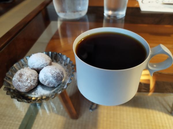 珈琲のお供に、スノーボールというクッキー、チョコレート味を、いただきます。さっくり、ほんのりとした甘み。コーヒー、700円、スノーボール一個100円、でした。