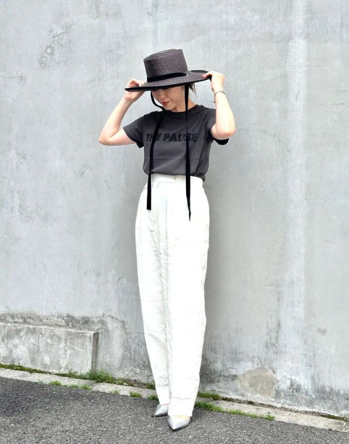 カジュアルなモノトーンのワンツーコーデが一気に華やぐツバ広ハットのパワーたるや!