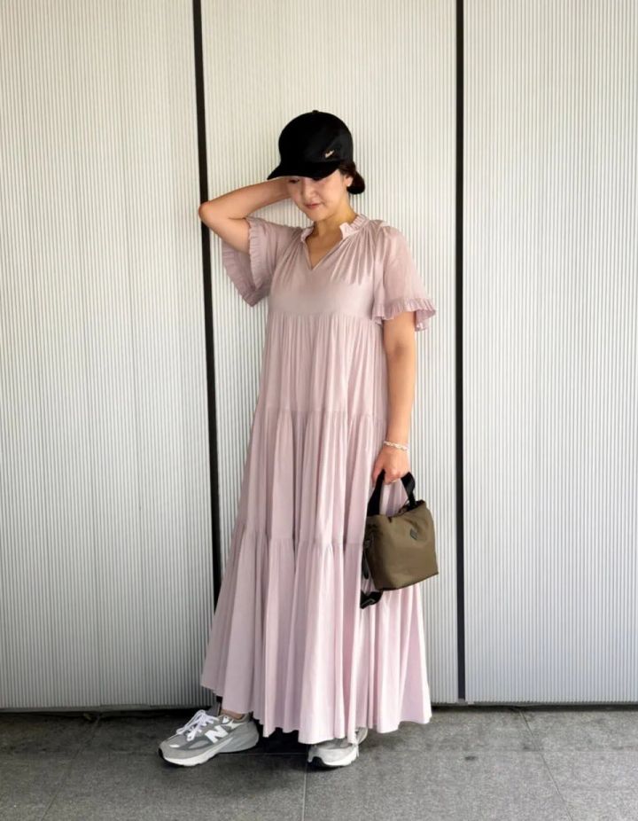 サッとかぶるだけでコーデのバランスを整えてくれる優秀アイテムキャップ。甘いドレスが一気にこなれムードに。