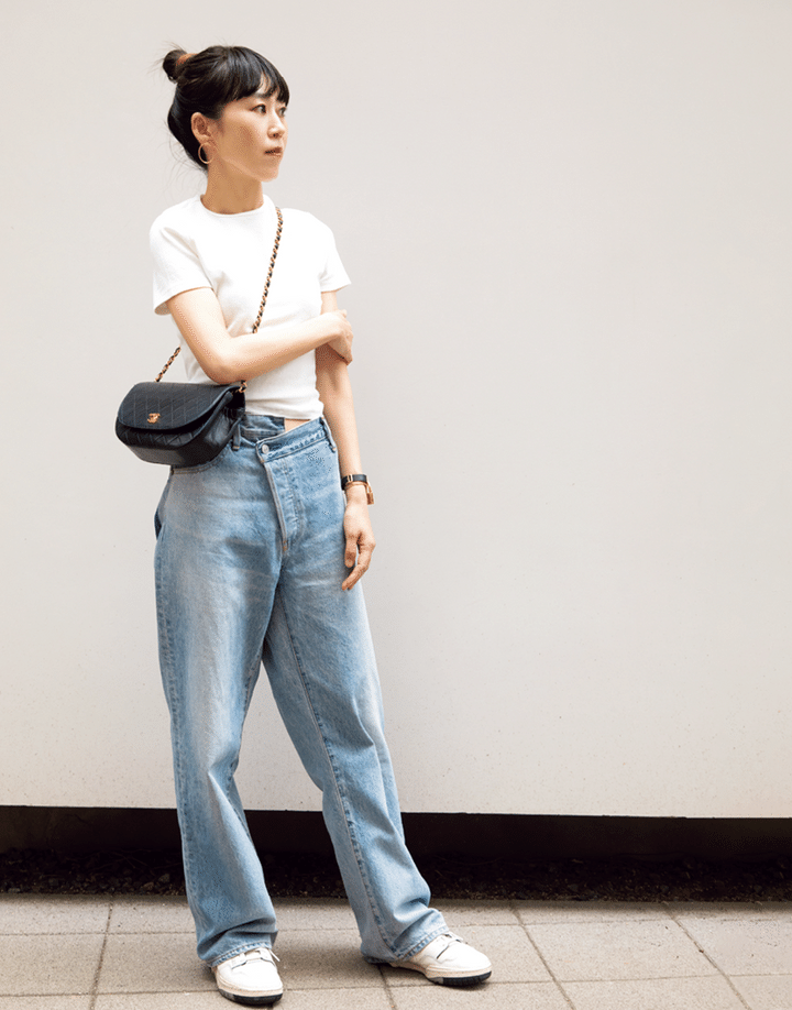 白T×デニム×スニーカー。シャネルのショルダーバッグを取り入れるだけで、夏のベーシックスタイルを大人の着こなしに!