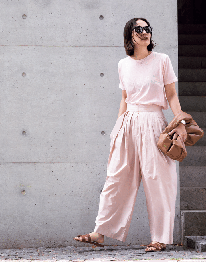 ピンクのワントーンが上級者なTシャツスタイル。足元とバッグに差したラグジュアリーなキャメルレザーがコーデを品よくドレスアップ。