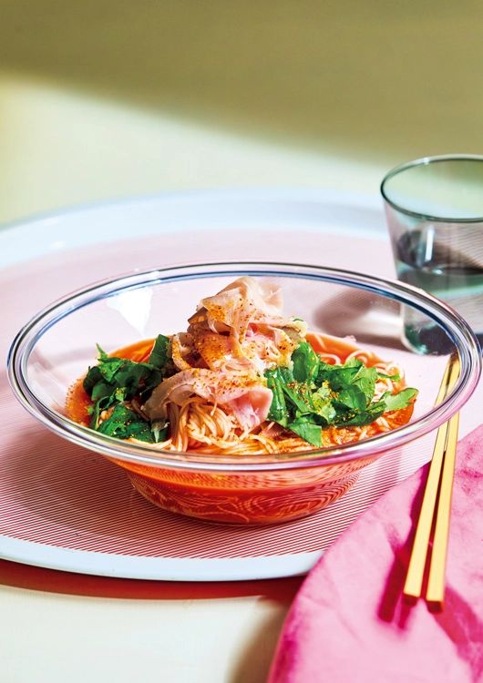 生ハムの塩けで、夏の暑い日でも箸が進みます。めんは冷水で締めることで、つるんとした喉越しに。バジルの葉の代わりに大葉でも◎。一味唐辛子はたっぷりかけましょう。