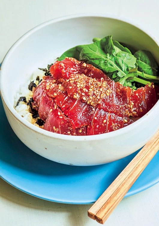 しょうゆにすりごまを入れ、とろっとしたペースト状にすることで、まぐろとからみやすく。まぐろの漬け時間は5分程度でOKだから、疲れた夜にもさっと作れちゃいます。