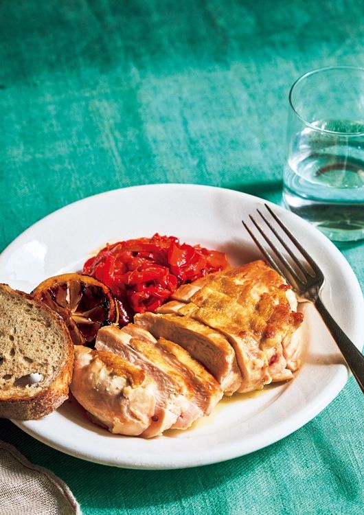 ④鶏肉を休ませている間に、③のフライパンにレモンをのせ、水けを飛ばすようにパプリカを中火で炒めつつ、レモンに焦げ目がついたら、③とともに器に盛りつけ、お好みでパンを添える。