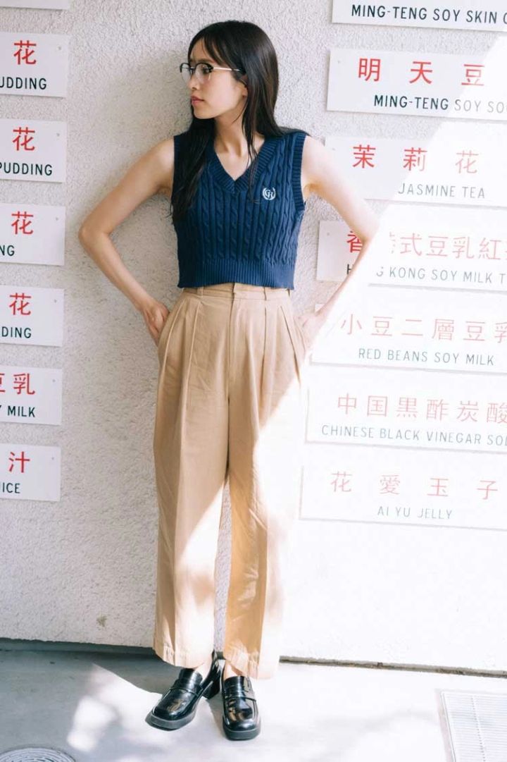 ネイビーニットベスト 3,289円/スピンズ ベージュチノパン 13,200円/COCO DEAL(ココ ディール) メガネ 26,840円/Ray-Ban(ルックスオティカジャパン) 黒ローファー2,990円/神戸レタス