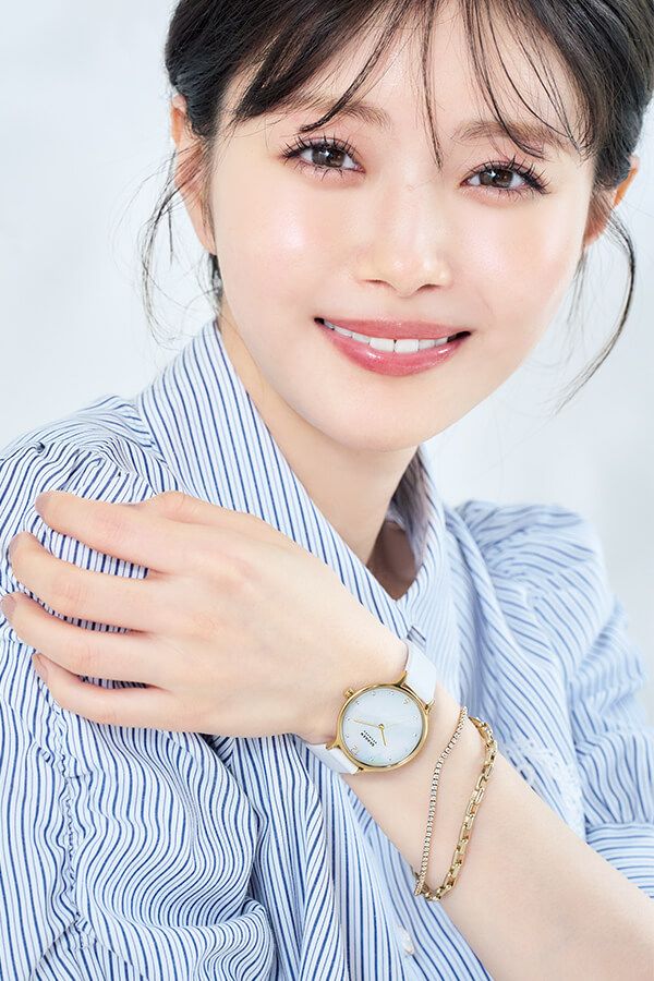 「ANITA LILLE」ウオッチ[SS×レザー×MOP、30mm]¥22,550/SKAGEN、ブレスレット¥9,350/FOSSIL(ともにフォッシルジャパン) シャツ¥10,890/Swingle(Swingle 有楽町マルイ店)