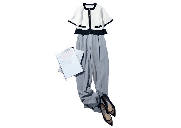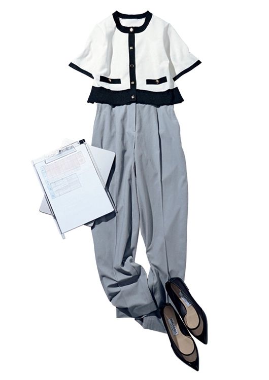 バイカラーが上品なアクセントになったパンツルックでクールに。冷房対策にもなるジャスグリッティーの短丈カーデ、ジャケット見えするから本当に有能!パンツはテーパードでスッキリ見せが叶います。