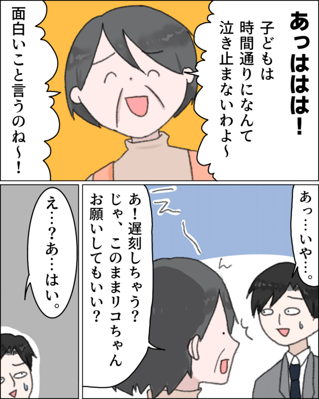 「子供は時間通りになんて泣き止まないわよ~面白いこと言うのね~!」